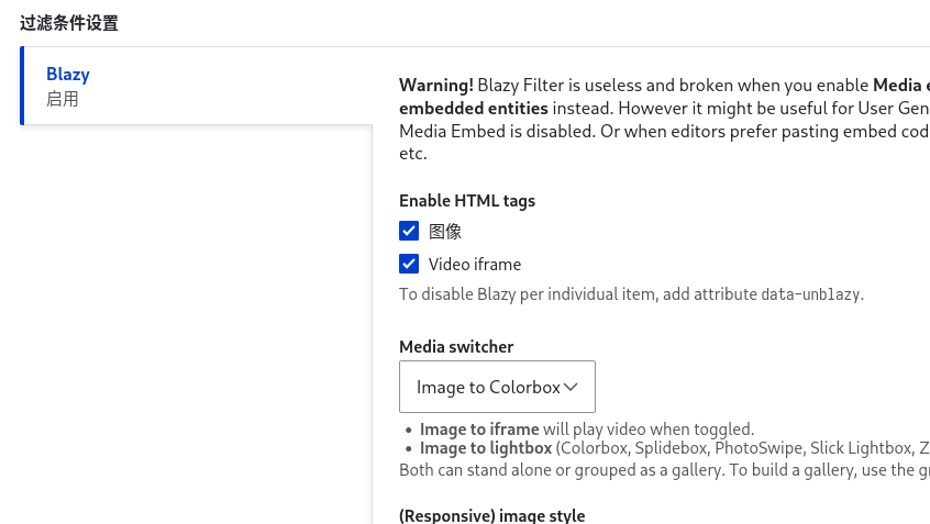 下拉 启用过滤器里 勾选 Blazy ,启用 Blazy,然后 Media switcher 里选择 image to Colorbox,保存。